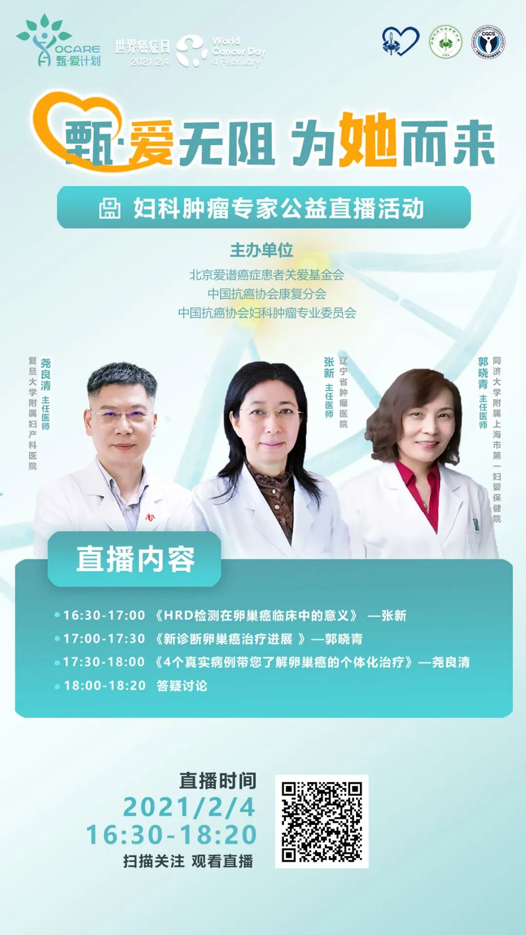 始于帮助卵巢癌患者顺利度过疫情的初心,北京爱谱癌症患者关爱基金会、中国抗癌协会康复分会联合中国抗癌协会妇科肿瘤专业委员会特别开展了“甄爱无阻 为她而来”妇科肿瘤专家公益直播系列活动,为患友们送去妇瘤大咖、医护人员的专业指导和暖心关爱。每期直播活动邀请2-5位妇瘤大咖与患友们在线“云”交流,传递卵巢癌科学治疗和康复知识,涉及随访、就诊指南、遗传咨询、科学饮食、日常运动指导和心理调节等多方面,并通过现场答疑为患友们带来点对点的关爱和解决方案。