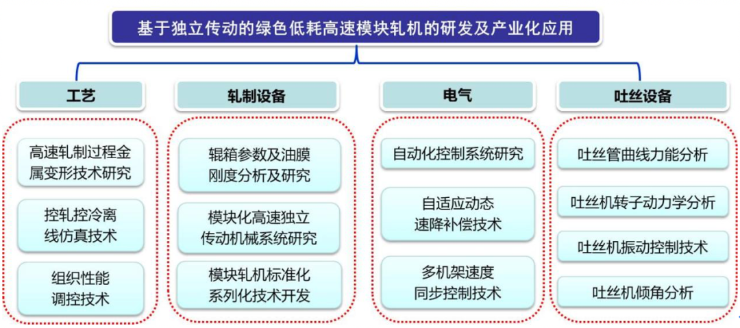 为解决高速线材行业所存在的痛点问题,中冶赛迪高速线材技术研发团队颠覆传统的集中传动技术思维,以独立传动的模块化高速线材生产技术为关键,通过对高速独立传动轧制过程金属变形、控轧控冷离线仿真、组织性能调控、模块化高速轧制装备及吐丝装备、自动化控制等关键技术的研究,创新开发出了全新的线材绿色、低耗独立传动式模块化高速轧机工艺、装备及控制技术,并实现了产业化应用。