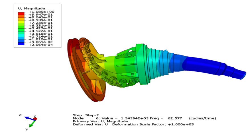 3、建立了吐丝管曲线力能模型,开发了曲率光滑的吐丝管曲线,降低了线材运行阻力;开发出吐丝头非对称转子动力学分析软件,实现了吐丝头轻量化设计,解决了吐丝头动平衡问题;采用阻尼减振装置降低了吐丝机的振动幅值。开发了120m/s的20度倾角吐丝机,可实现更大规格范围线材的低温高速吐丝成圈。
