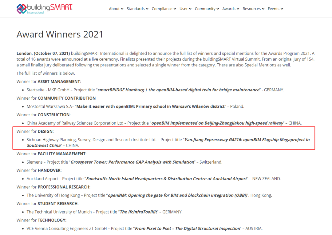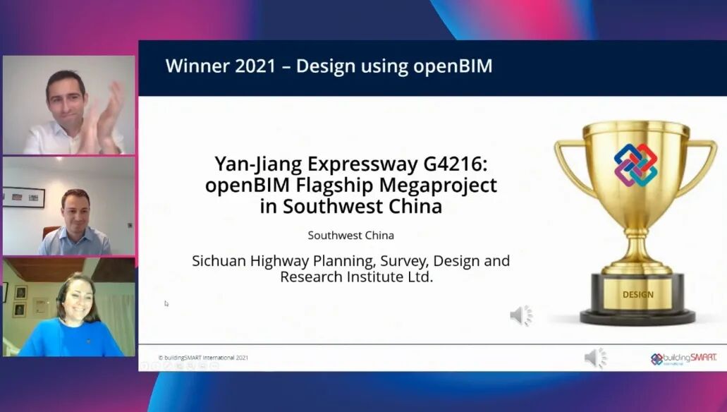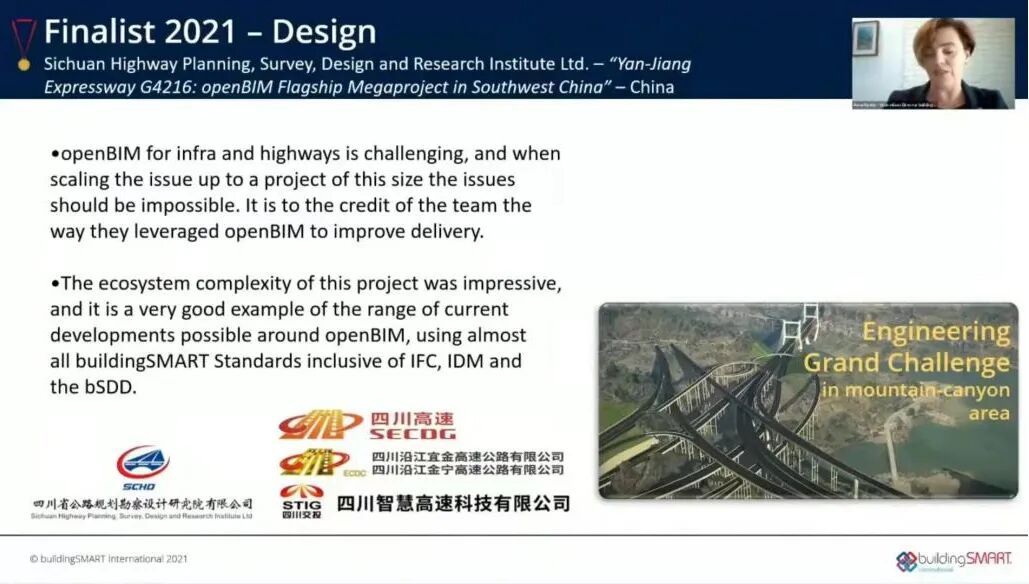 近日,在BuildingSMART International(bSI,建筑智慧国际联盟)发起的国际BIM大赛中,由蜀道集团四川高速公路建设开发集团有限公司、四川沿江宜金高速公路有限公司、四川智慧高速科技有限公司及四川省公路规划勘察设计研究院有限公司联合申报的“G4216沿江高速——在中国西南地区应用openBIM的超级工程”项目获评buildingSMART设计组第一名,这是国内高速公路BIM项目首次夺得全球BIM领域最高奖项。