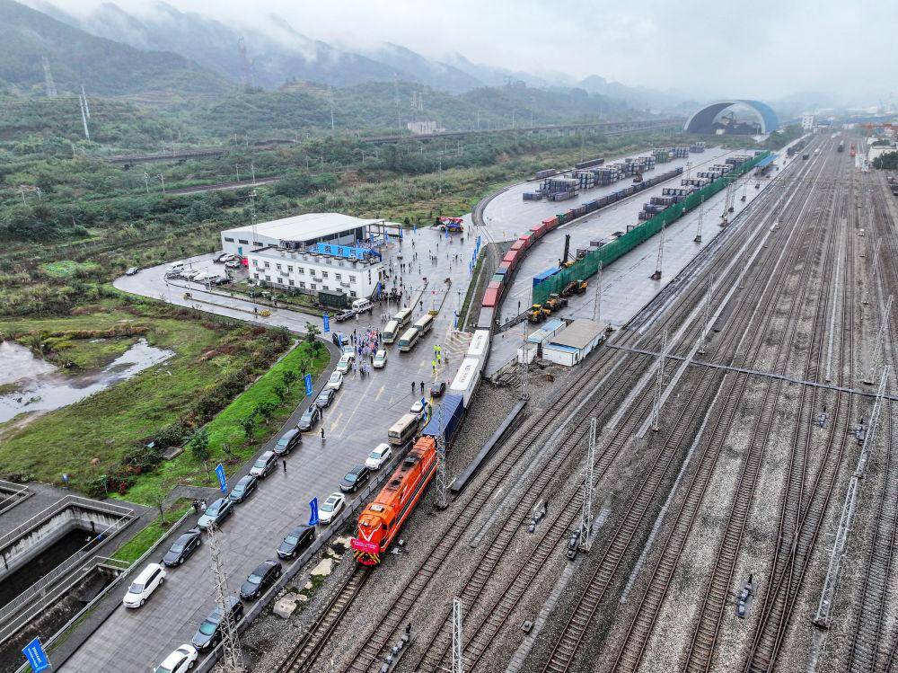 11月19日,重庆市动力锂电池全国铁路试运首发班列在重庆长寿渝巴专用铁路顺利发车。新华社记者 唐奕 摄