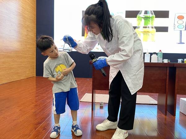 课堂上,科学老师与孩子们不断互动,邀请小朋友上台亲自操作实验,或到观众席让大家近距离观看化学反应,帮助孩子们亲身感受化学科学的神奇与奥秘。整个课堂持续时长近一个多小时,小朋友们在轻松欢快的氛围中受到了别样的化学教育。课堂结束后,许多小朋友都舍不得离开,与科学老师和志愿者合影,纪念此次别样的化学视觉之旅。