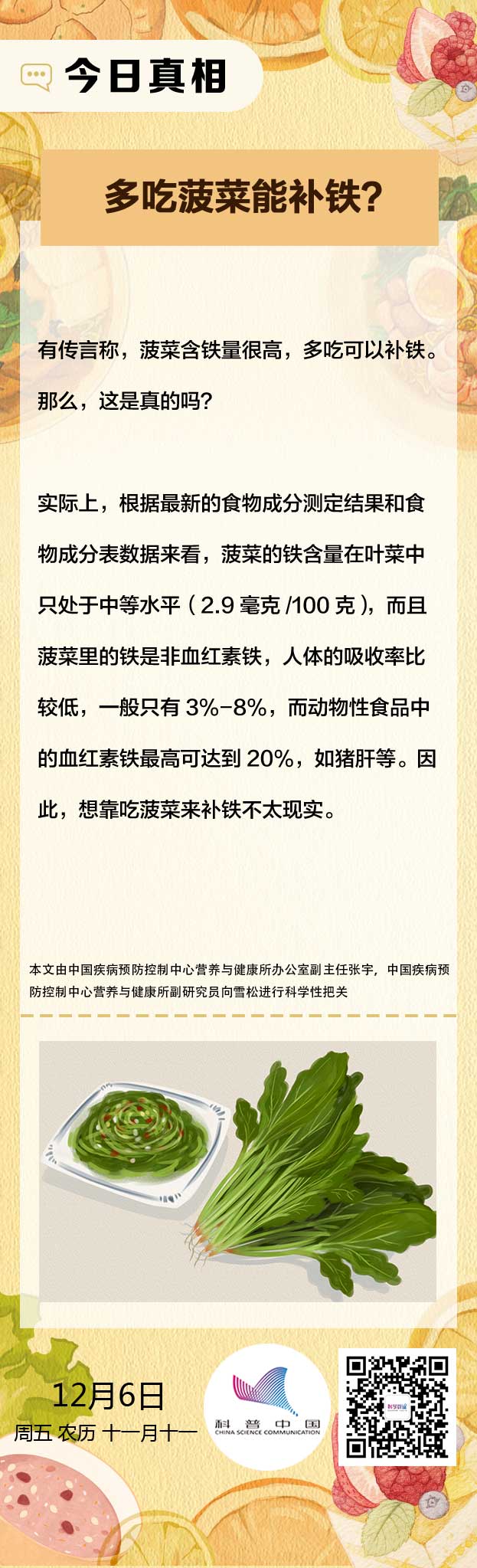 根据最新的食物成分测定结果和食物成分表数据来看,菠菜的铁含量在叶菜中只处于中等水平(2.9毫克/100克),而且菠菜里的铁是非血红素铁,人体的吸收率比较低。