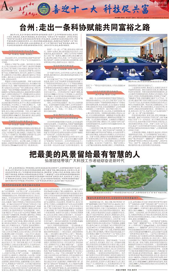 二是坚持项目为媒、聚才引智,全面开展“科创中国试点突破年”行动。依托“科创中国”丰富资源,争取承办2022全国“科创中国”现场会,全力办好世界气候行动青年峰会,协助办好台州国际人才合作洽谈大会。实施“百名院士赋能台州高质量发展雄鹰计划”和“全国学会智汇台州”计划,推动两院院士、国家级学会服务台州主导产业,力争实现院士创业项目县市区全覆盖。全力打造三个创新平台。增设“台州院士之家”融合创新基地,做深做实椒江、玉环海智基地,创成省科协“国际学术交流中心”。
